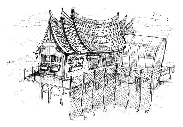 Putri merely chuckled and, as he looked back, pointed towards the glowing fluorescent blue pipes that ran around the frame of the house. He still marveled at the ingenious nature of it all. The roof outside collected rainwater through the gutters and curves of the Minangkabau design which generated power through the water’s high-speed movement.