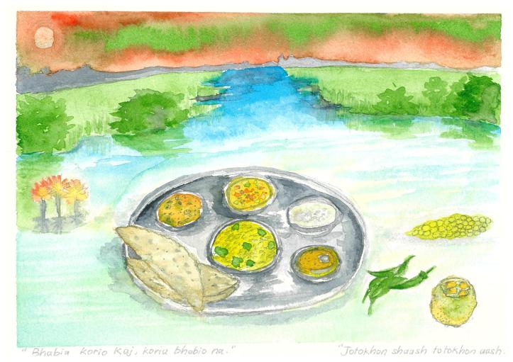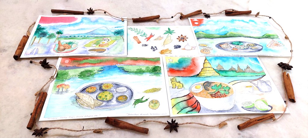 Each watercolour painting depicts a popular culinary cuisine from the four migrant communities. Each art piece depicts a dish or a combination of dishes and this is drawn against a background panorama of “home.”
