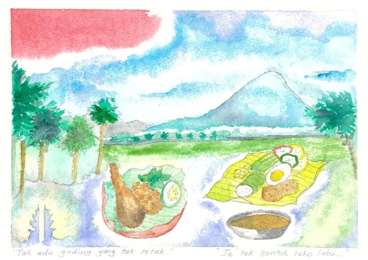 In the interviews, the individuals were asked about the popular dish of their homeland as well as questions about their experience living in Malaysia. The selection of the central watercolour image (the popular dish) was done from this process. The migrant individuals were also asked about a popular saying (and its meaning) in their native language which is then documented.